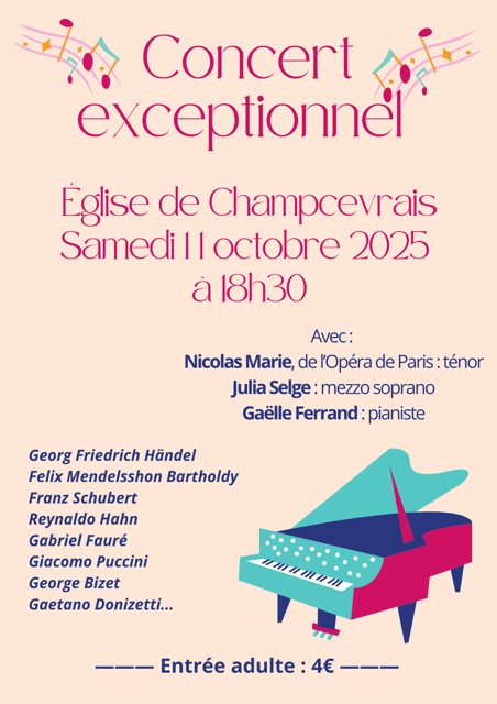 Ne manquez pas un rendez-vous musical d’exception le samedi 11 octobre 2025 à 18h30, en l’église de Champcevrais. Au programme, un voyage à travers les plus belles pages du répertoire classique avec des œuvres de Händel, Mendelssohn, Schubert, Hahn, Fauré, Puccini, Bizet, Donizetti… Avec des artistes de renom :